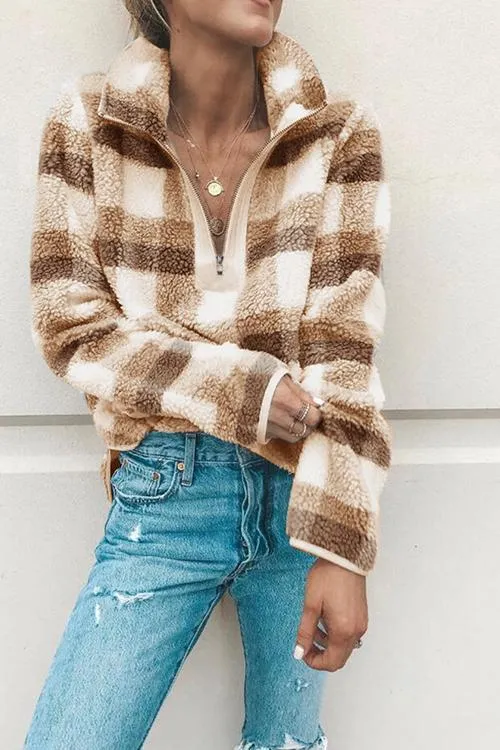 Isla Women’s Fleece Pullover – Checked Half Zip Sweater