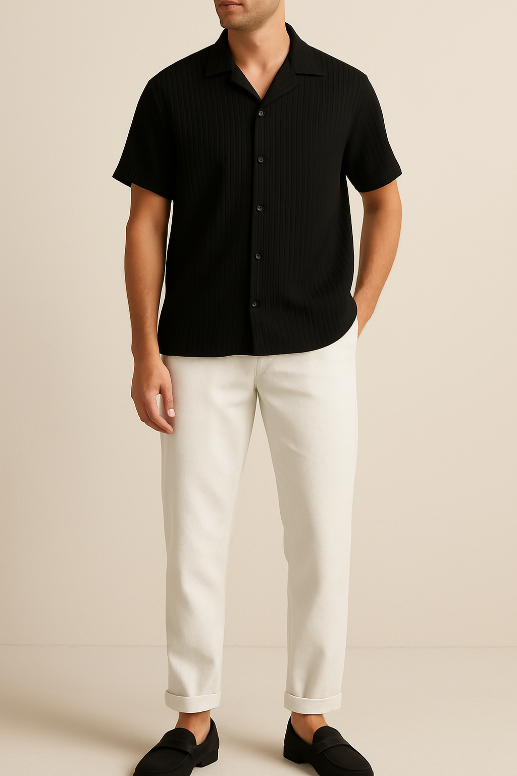 Person wearing a black short-sleeve shirt and white pants on a beige background