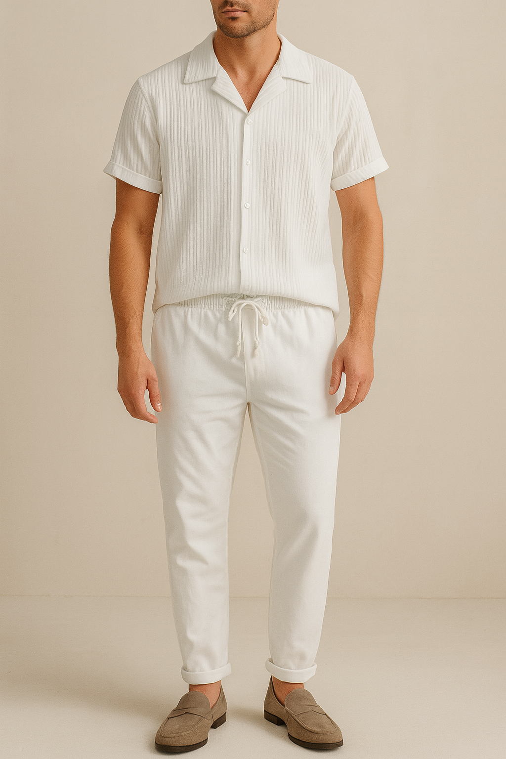 Man wearing a white striped shirt and white pants with beige shoes on a beige background