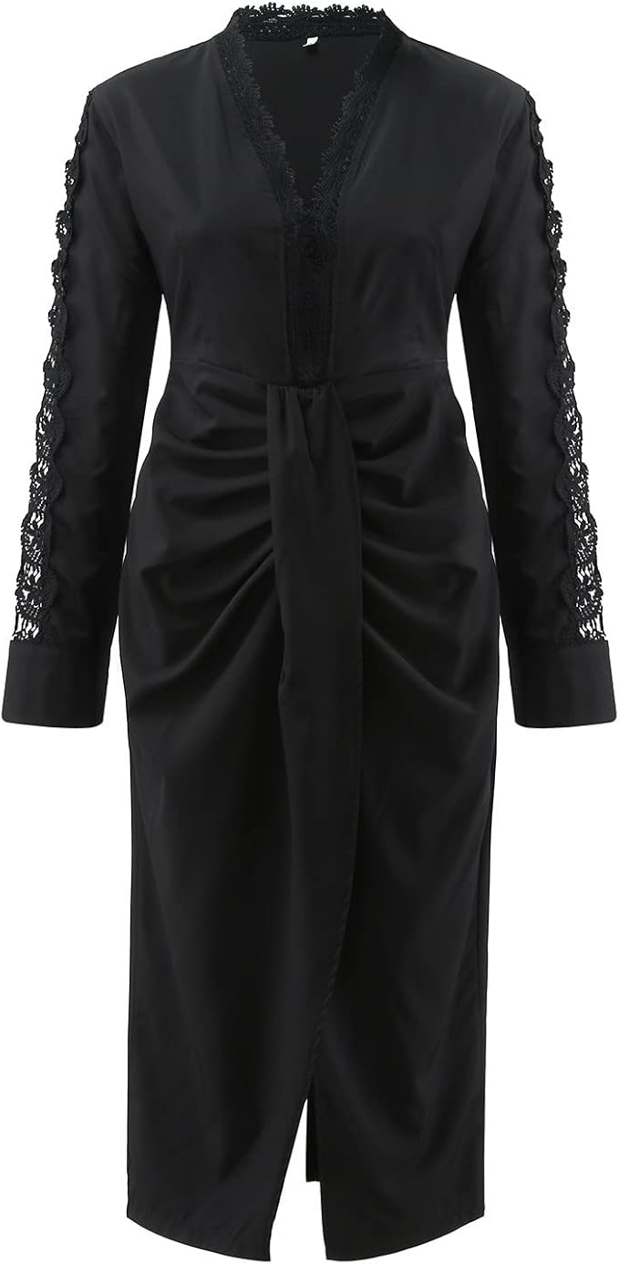 Barclay & Bloom | Damen Langarm Midi Kleid – Spitzenbesatz Drapierter Vorderteil Elegantes Kleid
