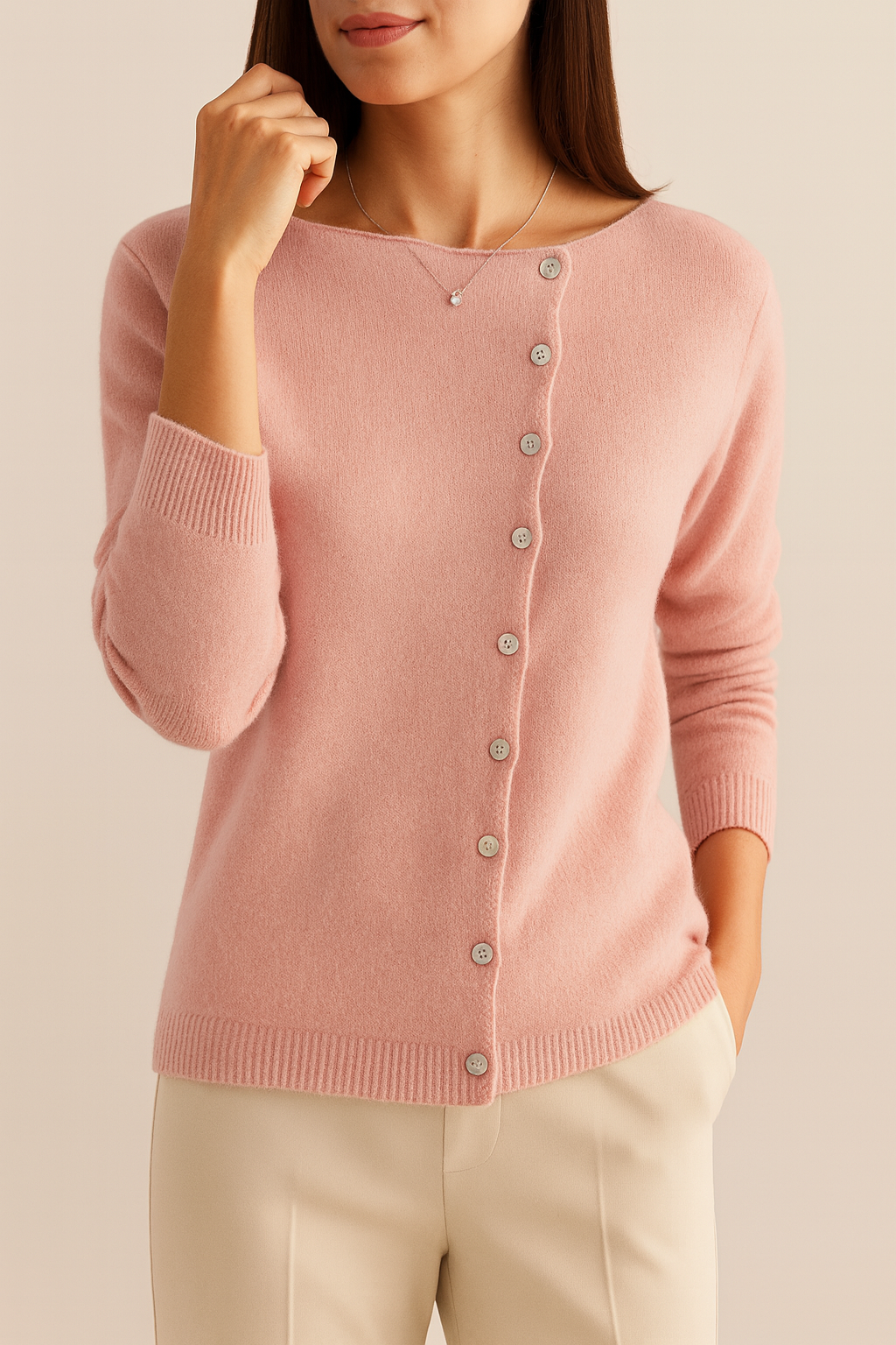 The asymmetric style adds a distinctive detail, while the buttons provide adjustable closure. This cardigan is suitable for casual and layered outfits.