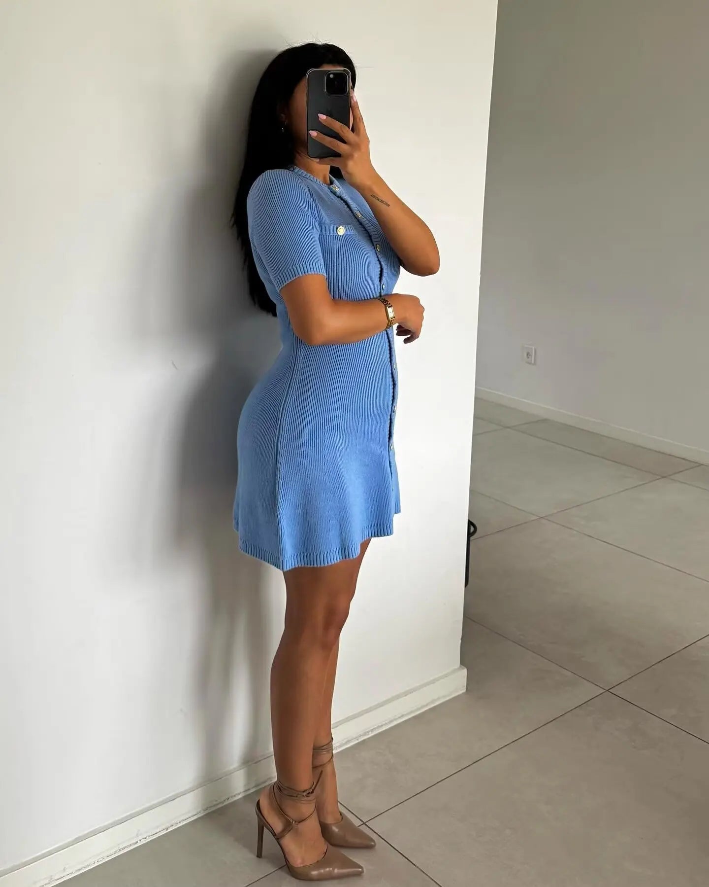 The ribbed texture adds subtle detail to the design, while the gold-tone buttons run down the front for easy styling. The Amelia button-up knit mini dress can be paired with sandals, flats, or boots for various settings during spring or summer seasons.