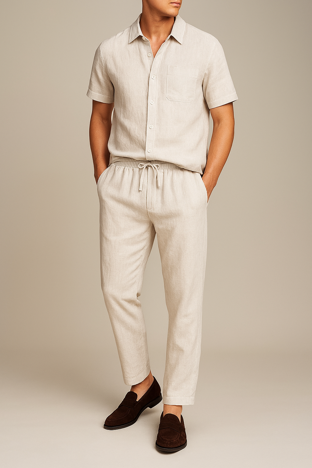 Man wearing a beige linen shirt and pants with brown shoes on a neutral background