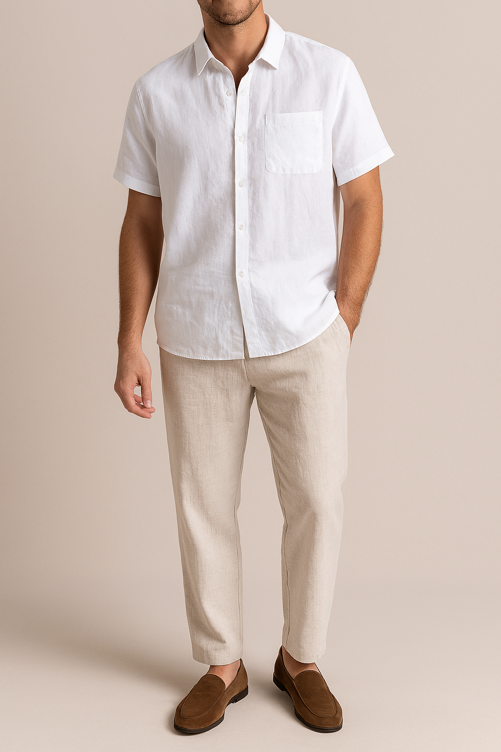 Man wearing a white short-sleeve shirt and beige pants against a beige background