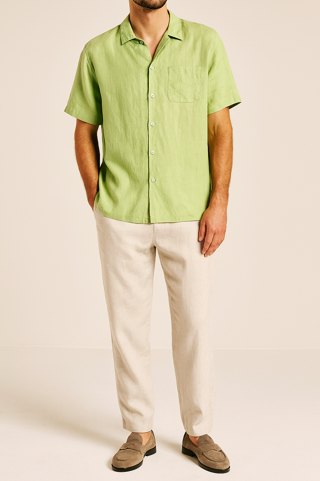 Man wearing a green shirt and beige pants on a plain background