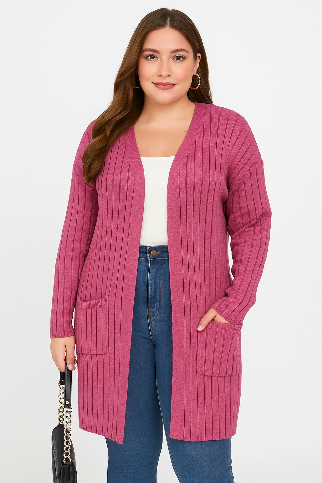 Woman wearing a pink ribbed cardigan over a white top and blue jeans, holding a black handbag.