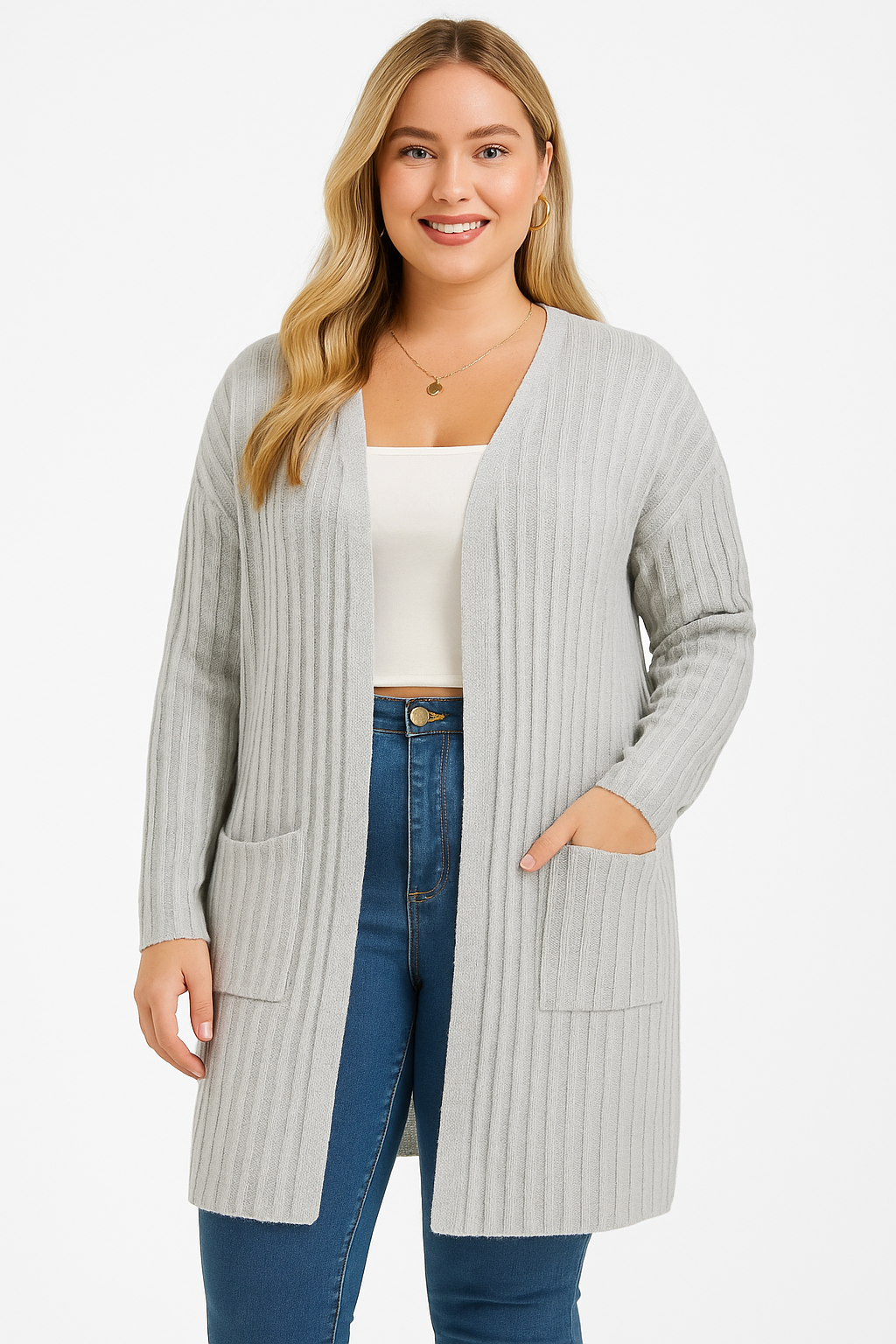 Woman wearing a light gray ribbed cardigan over a white top and blue jeans on a white background