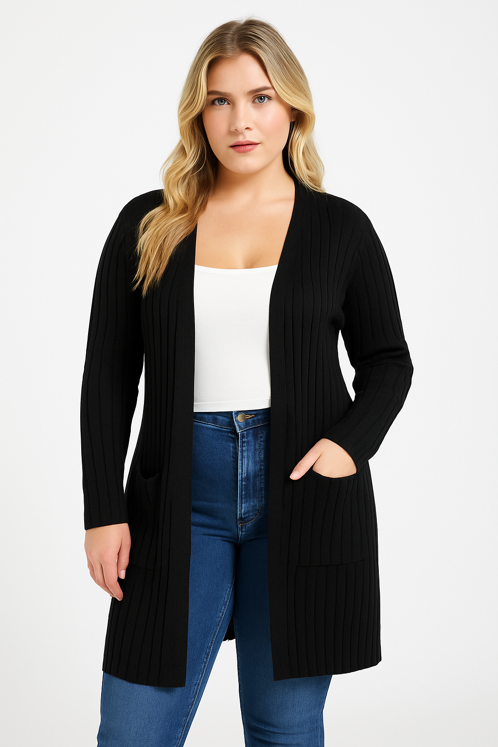 Woman wearing a black cardigan over a white top and blue jeans on a white background