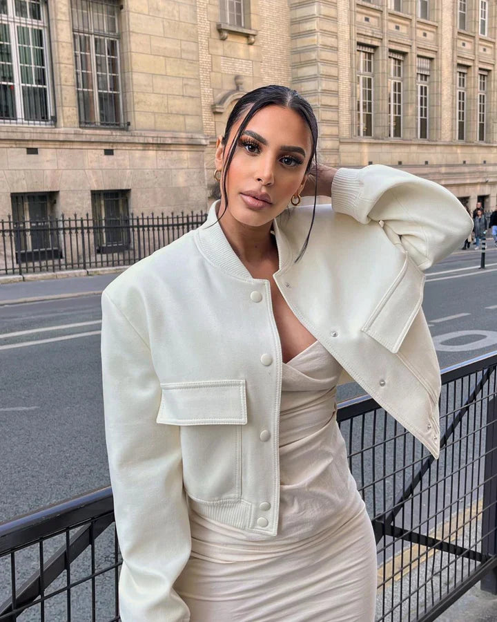 The Raquel Women’s White Bomber Jacket features a front zip closure, ribbed cuffs and hem, and a classic bomber silhouette. Made from woven fabric, this jacket is suitable for casual, streetwear, and transitional-season outfits.