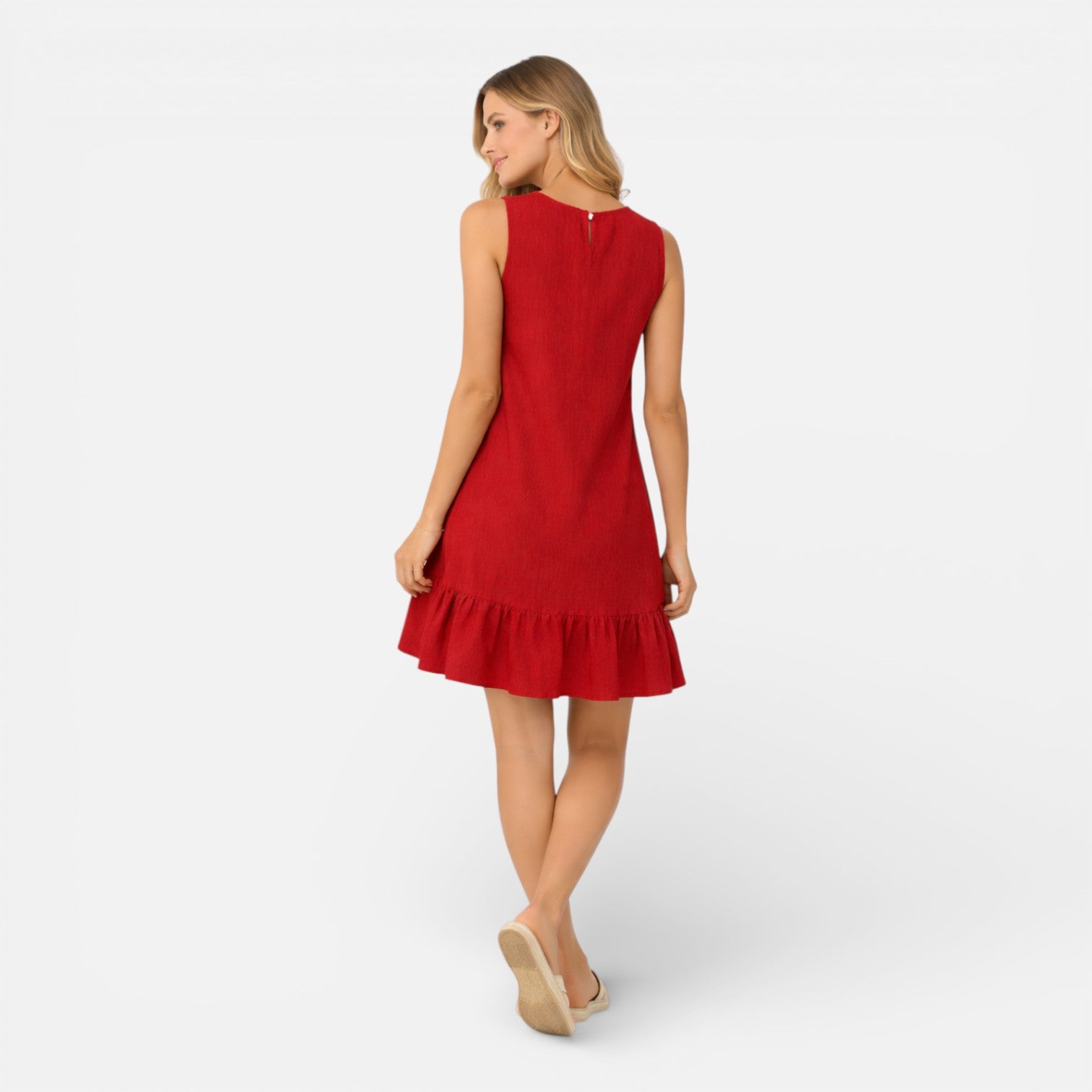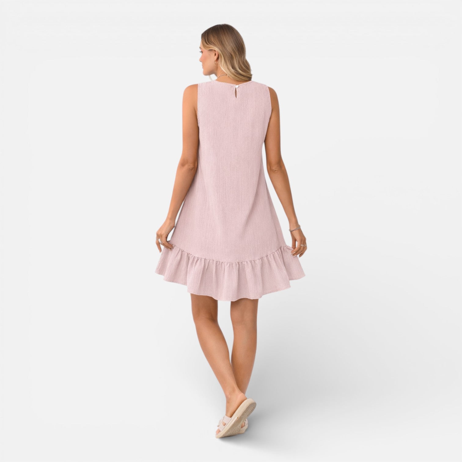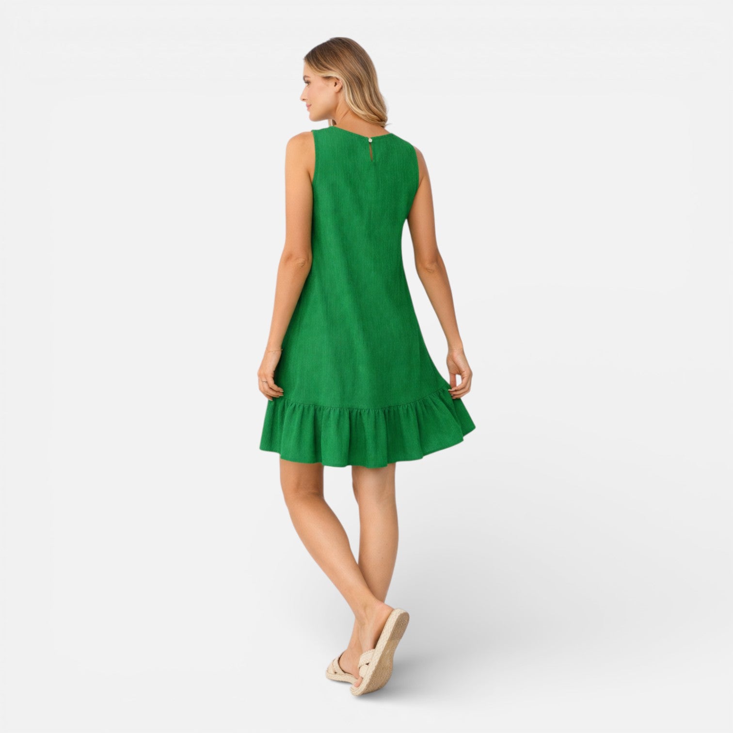 Dames lichte zomerjurk zonder mouwen met ruches aan de zoom en A-lijn model