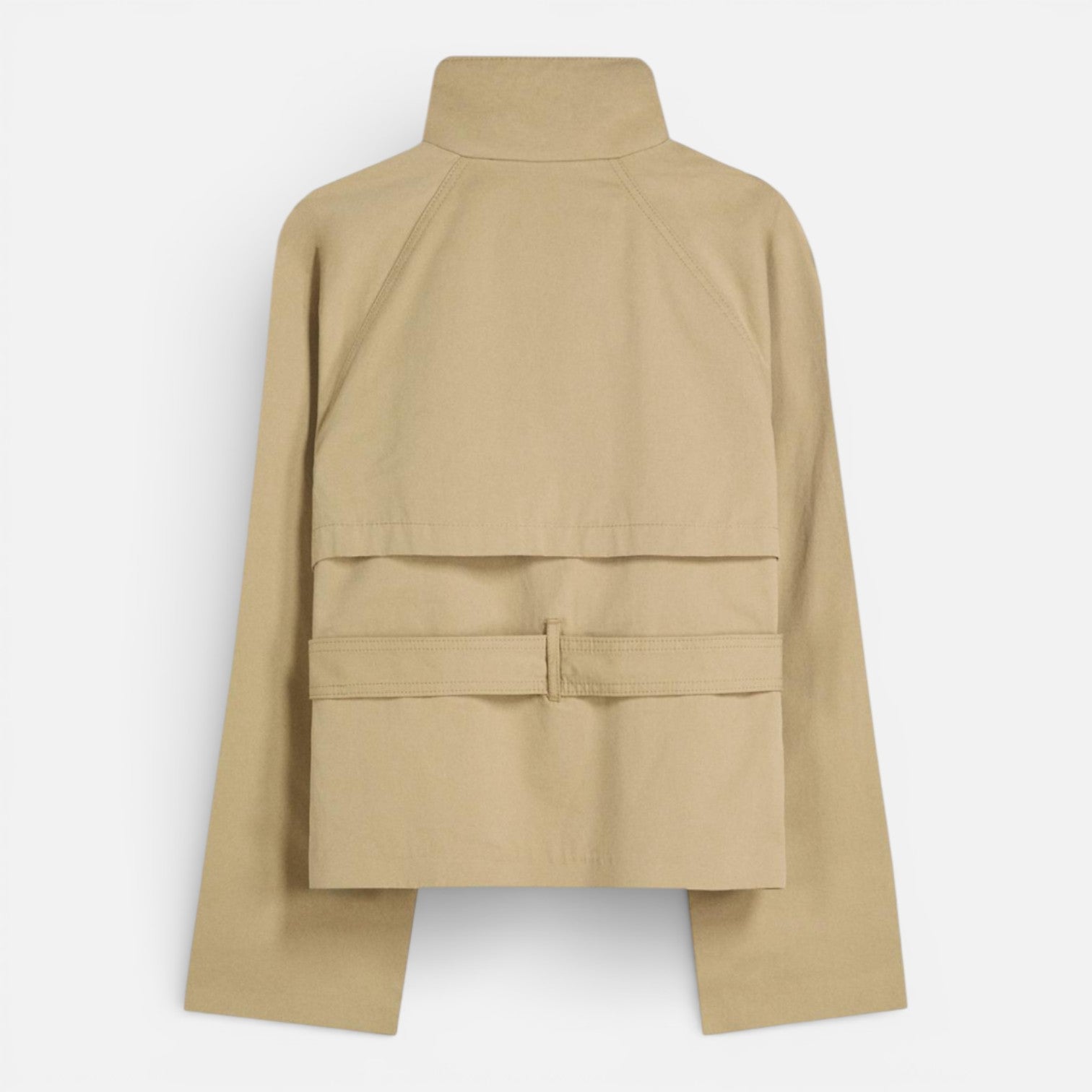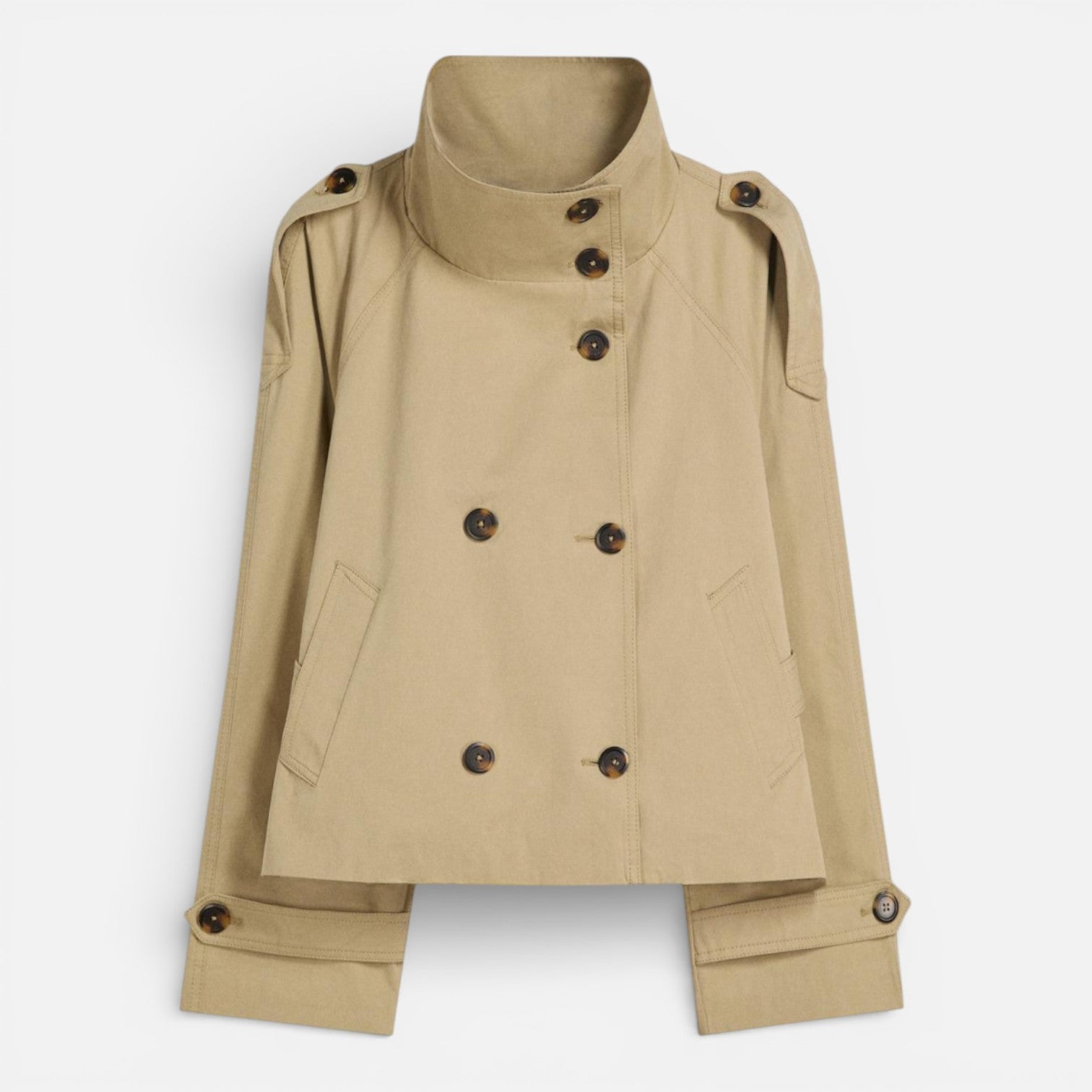 The Barclay & Bloom Women’s Trench Coat is a timeless outerwear piece designed for transitional seasons. This women’s short trench jacket features a double-breasted front with large buttons, a waist belt for adjustable fit, and a high collar that provides added wind protection. The lightweight woven fabric makes it ideal for layering during spring and autumn. The structured cut and neutral tone make this trench suitable for both casual and office wear.