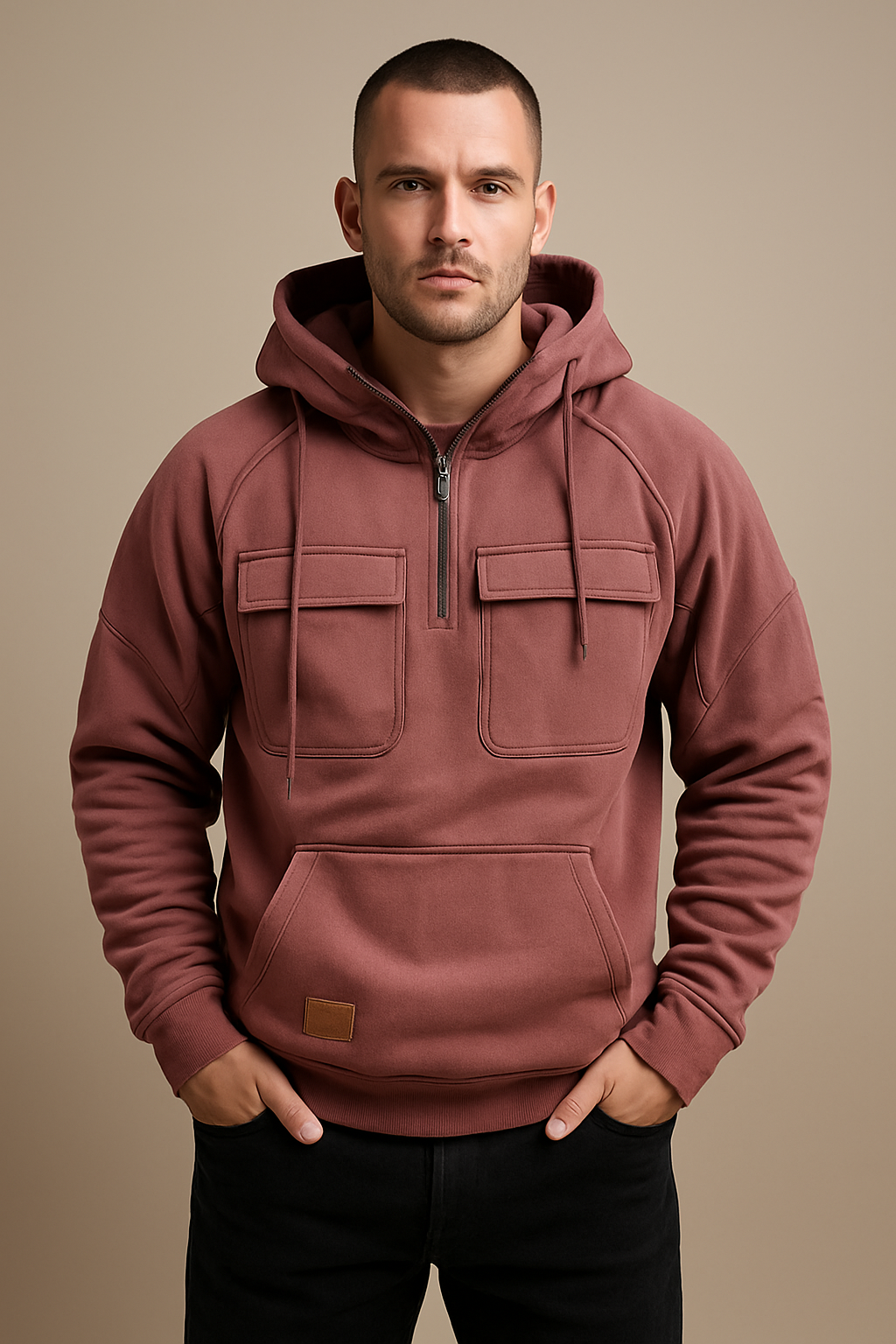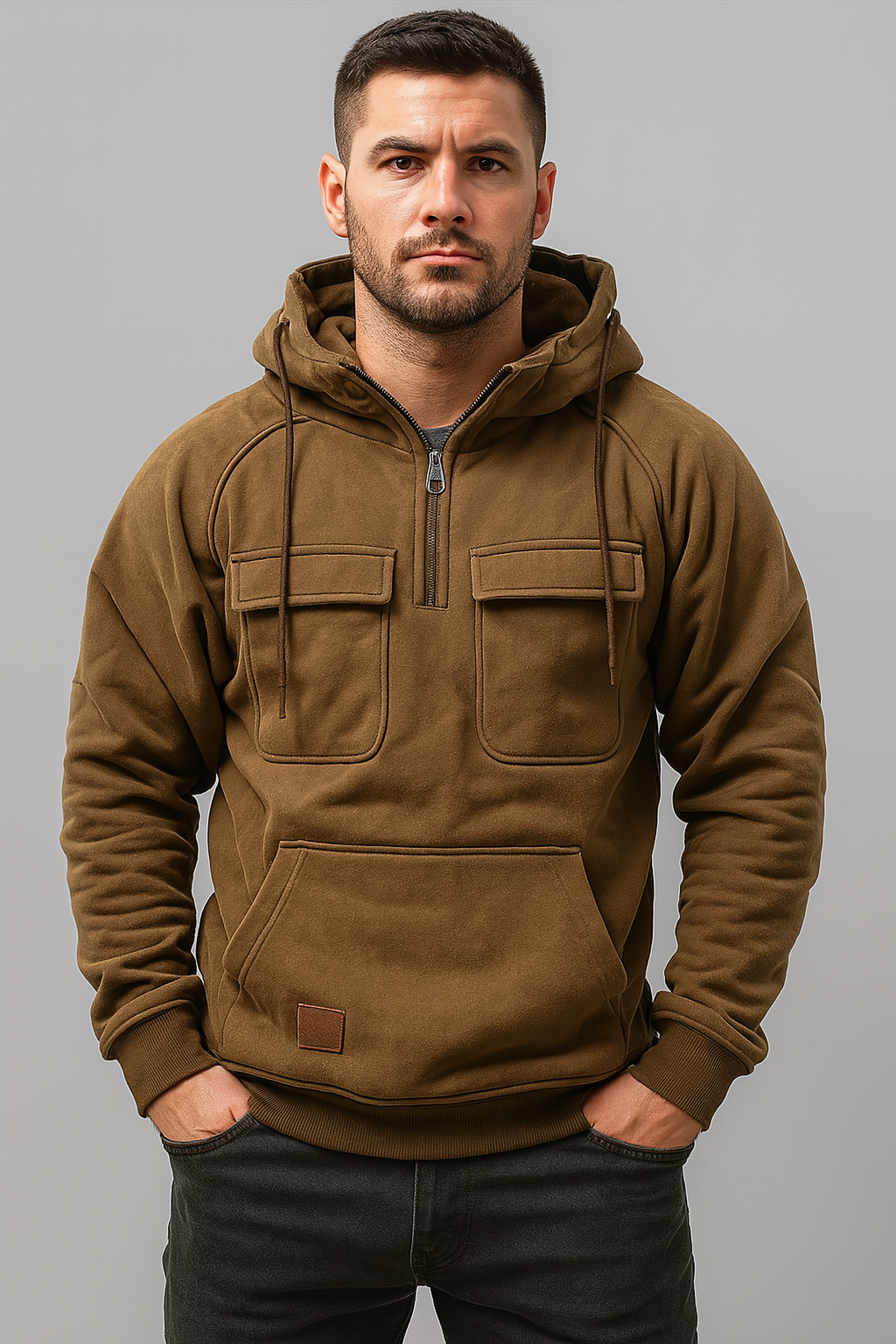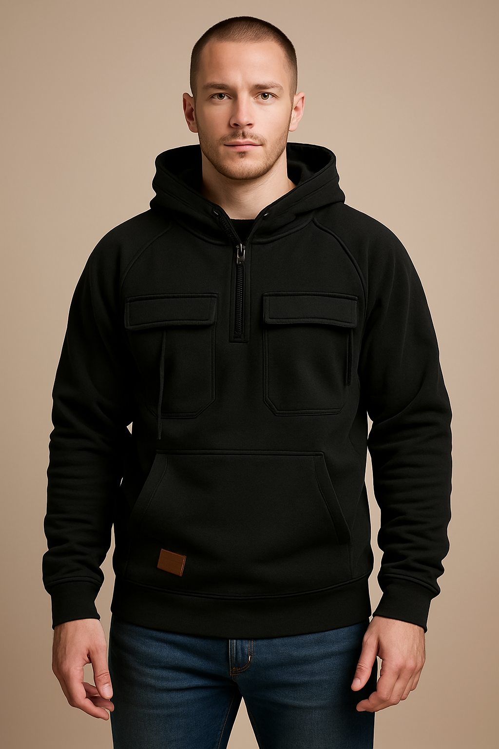 The Jari Cargo Hoodie features a relaxed fit and multiple pockets for functionality. Made from durable fabric, this hoodie includes front cargo pockets and a drawstring hood.