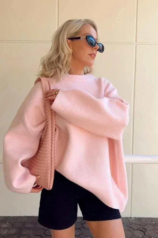 The Selene sweater features a relaxed silhouette with dropped shoulders and a ribbed crew neckline. Made from soft knit fabric, this long sleeve pullover is designed for comfort and easy styling.